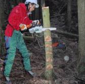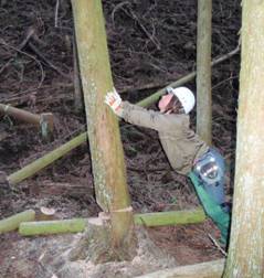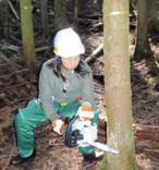 回し切りによる伐倒などを行い、時にはチェンソーを咬まれることもありました。