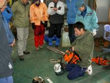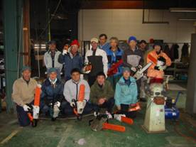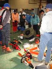 14人の参加者全員がチェンソーを抱えて その構造の勉強から、持ち方、セット方法、玉切りなどにチャレンジ。
