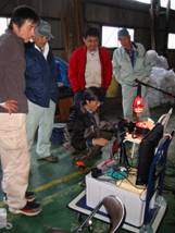 水野氏からチェンソーの説明を受けた後、まず現状の切れ味を確認するタイム測定を行い、目立て終了後に再度タイムを測定した、これまでの目立て講習会では教えられなかった刃の修正ポイントは4項目+1項目。覚えていますか?? お互い活動時に復習しましょう。