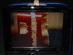 左側の写真は、チェンソーの切り屑をビデオ撮影し、モニターに映し出す準備をしているところ。